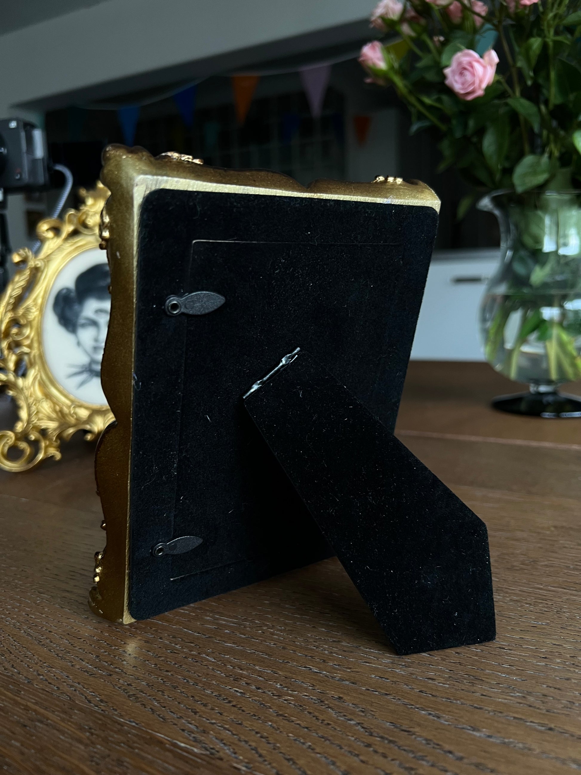 Unique surreal Victorian style portrait tattooed on a silicone skin, set in a classic gold-tone frame 18 cm by 13,5 cm. With a weight of 315 grams.
